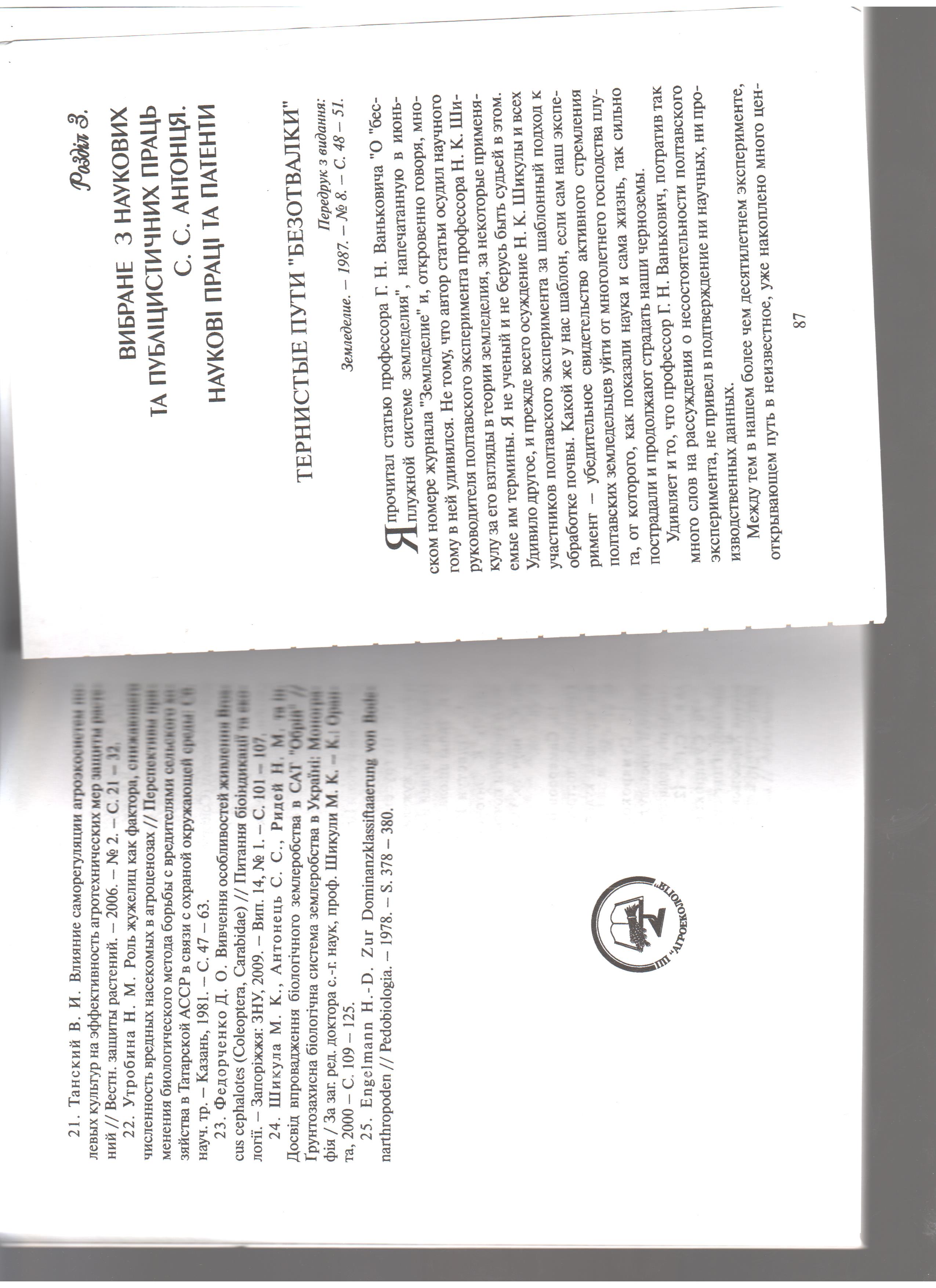 Писаренко В.М. Стабілізація фауністичних комплексів турунів (Coleoptera, carabidae) в умовах біологізації землеробства. Бентежний талант хлібороба: штрихи до портрета агроеколога Семена Антонця. Полтава. 2000. С. 71-85