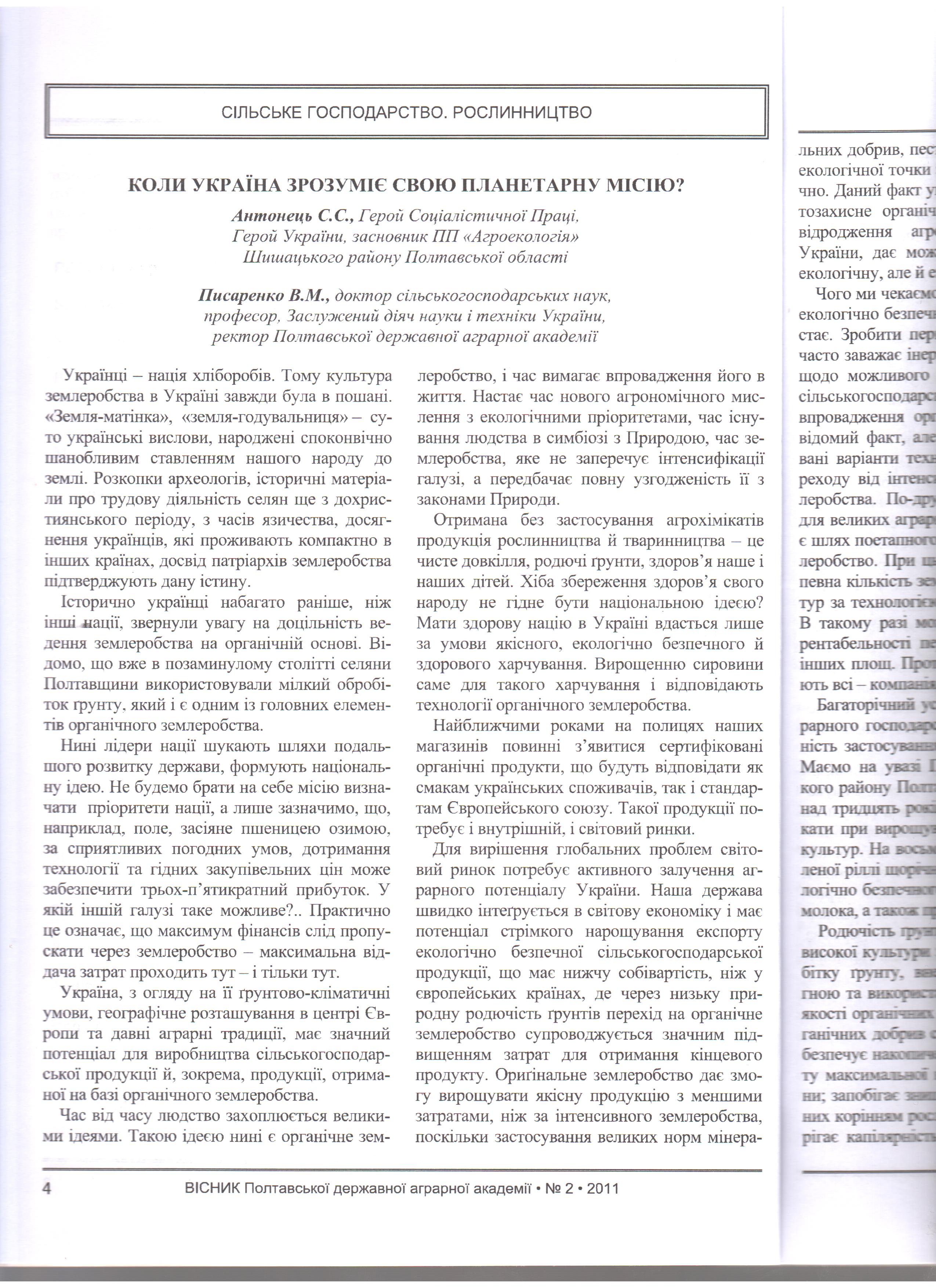 Писаренко В.М., Антонець С.С.. кили Україна зрозуміє свою планетарну місію?. Вісник ПДАА. 2011.№2.с.4-6