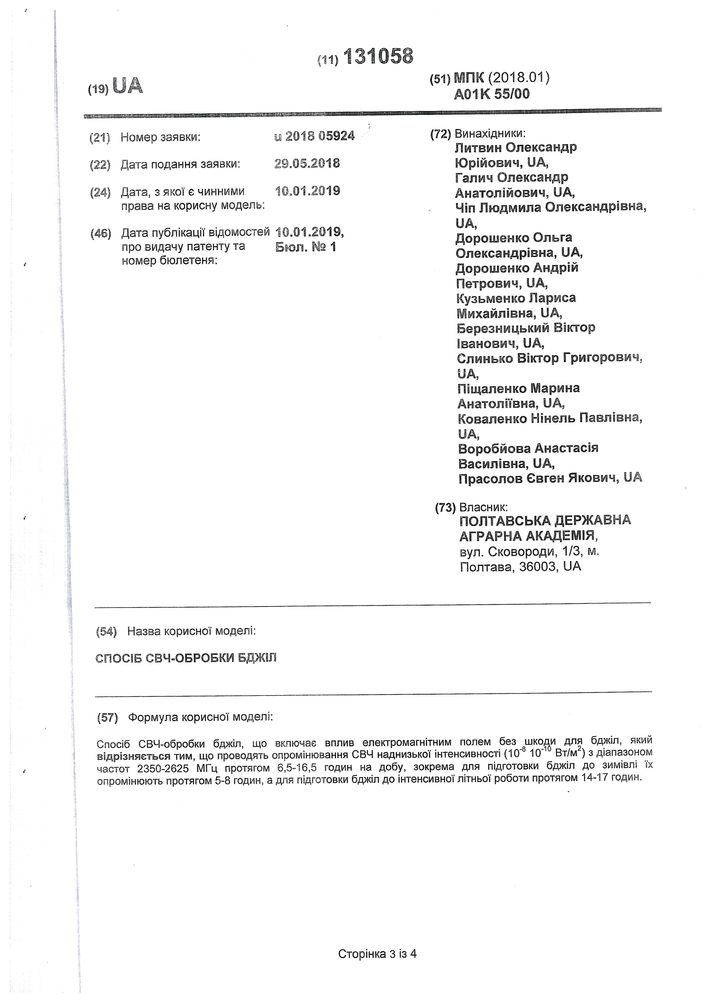 Патент на корисну модель №131058 Спосіб свч-обробки бджіл
