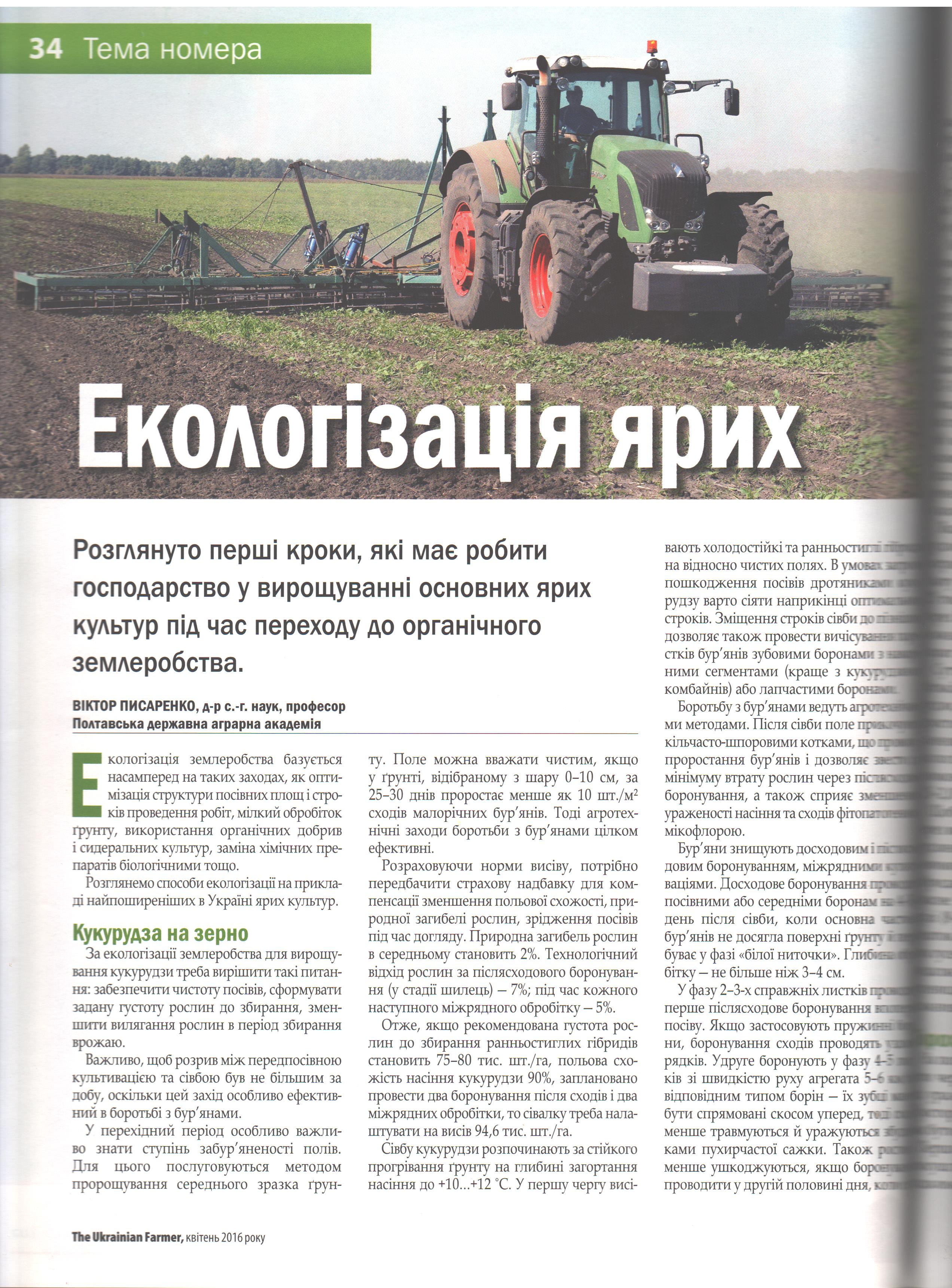 Писаренко В.М. Екологізація ярих. The Ukrainian farmer. 2016.№4(76). с.34-35