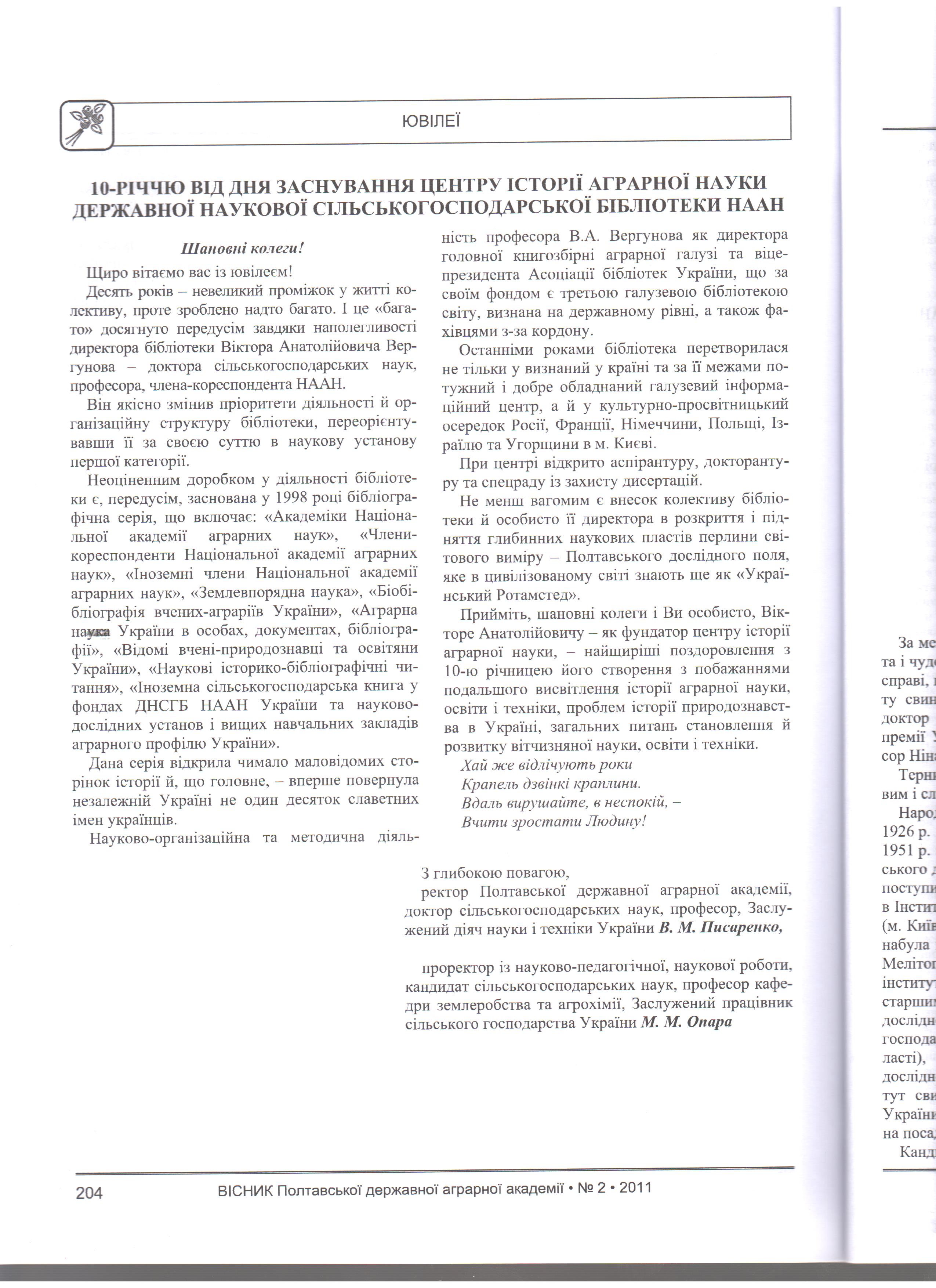 Писаренко В.М., Опара М.М.. 10-річчю від дня заснування центру історії аграрної науки державної наукової сільськогосподарської бібліотеки НААН. Вісник ПДАА. 2011.№2.с.204