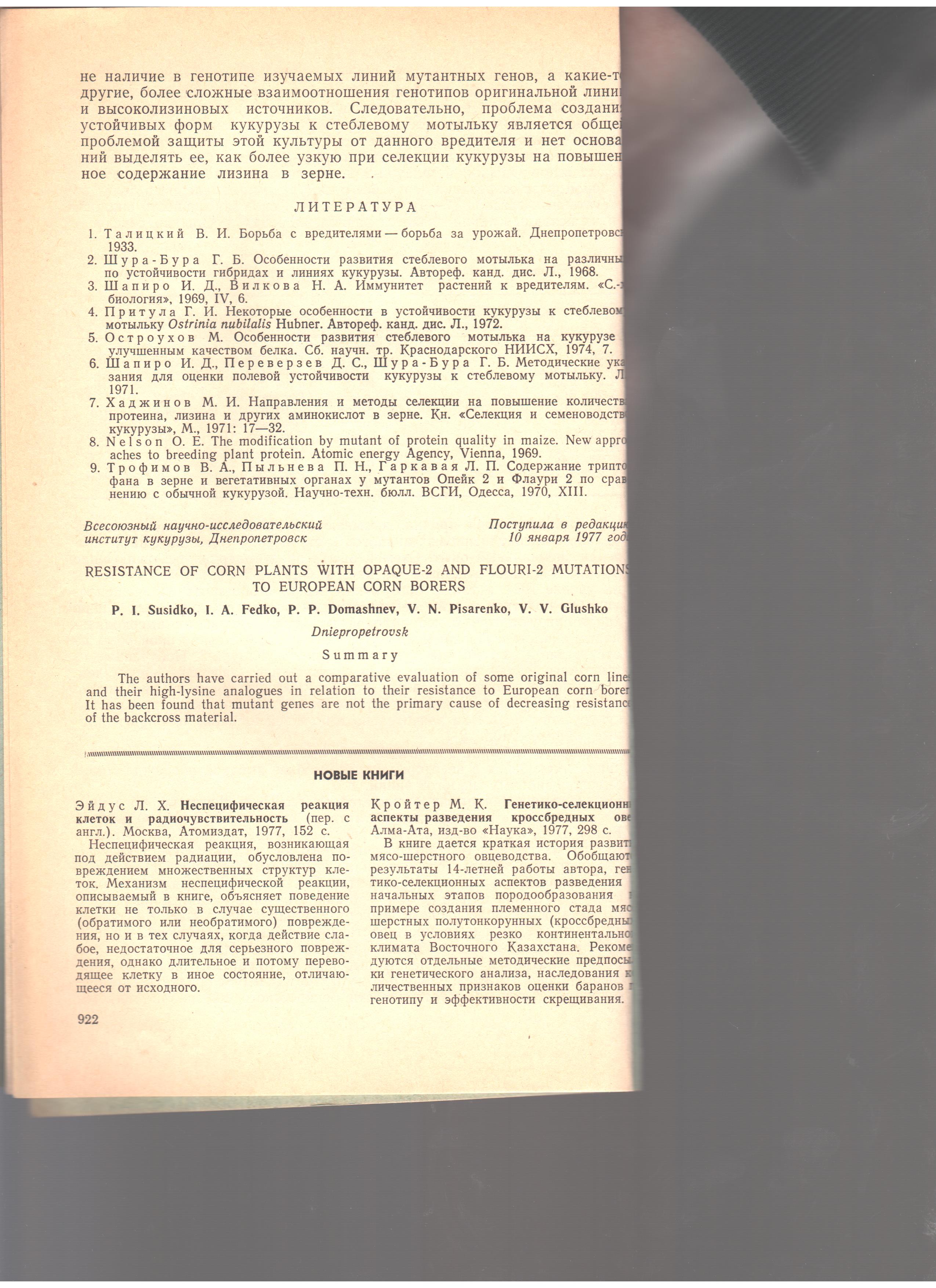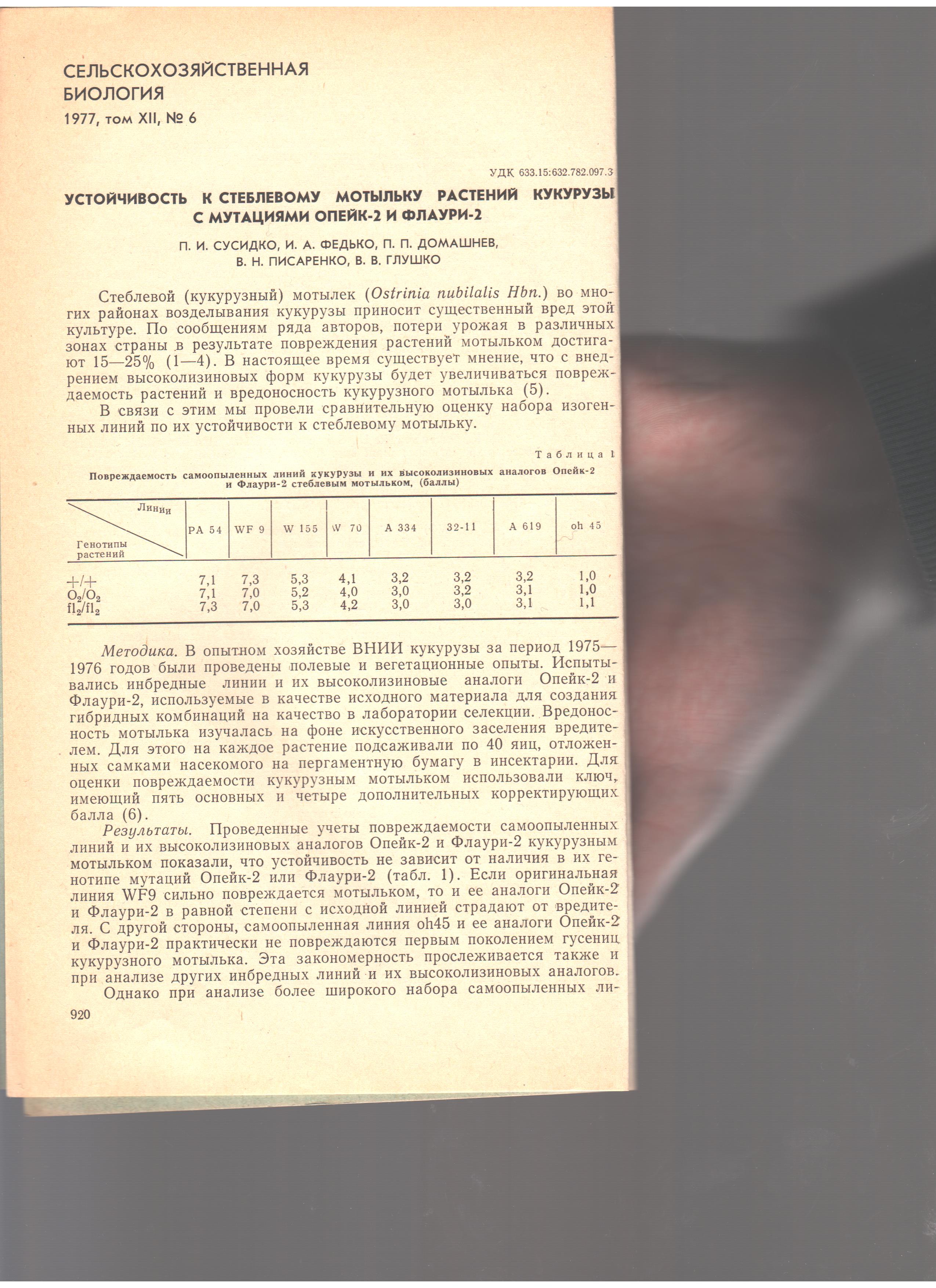 Писаренко В.Н., Сусидко П.И. Устойчивость к стеблевому мотыльку растений кукурузы с мутациями опейк-2 и флаури-2. Сельскохозяйственная биология. 1977. №6. С.920-922.
