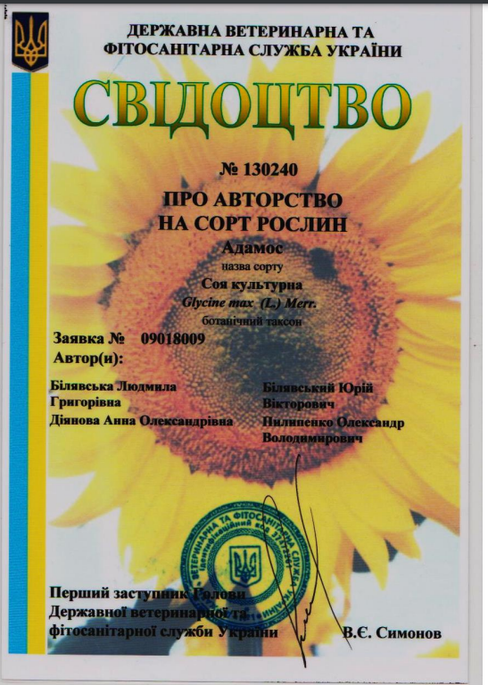 соя, сорт Адамос, селекція, урожайність, цінність, насінництво