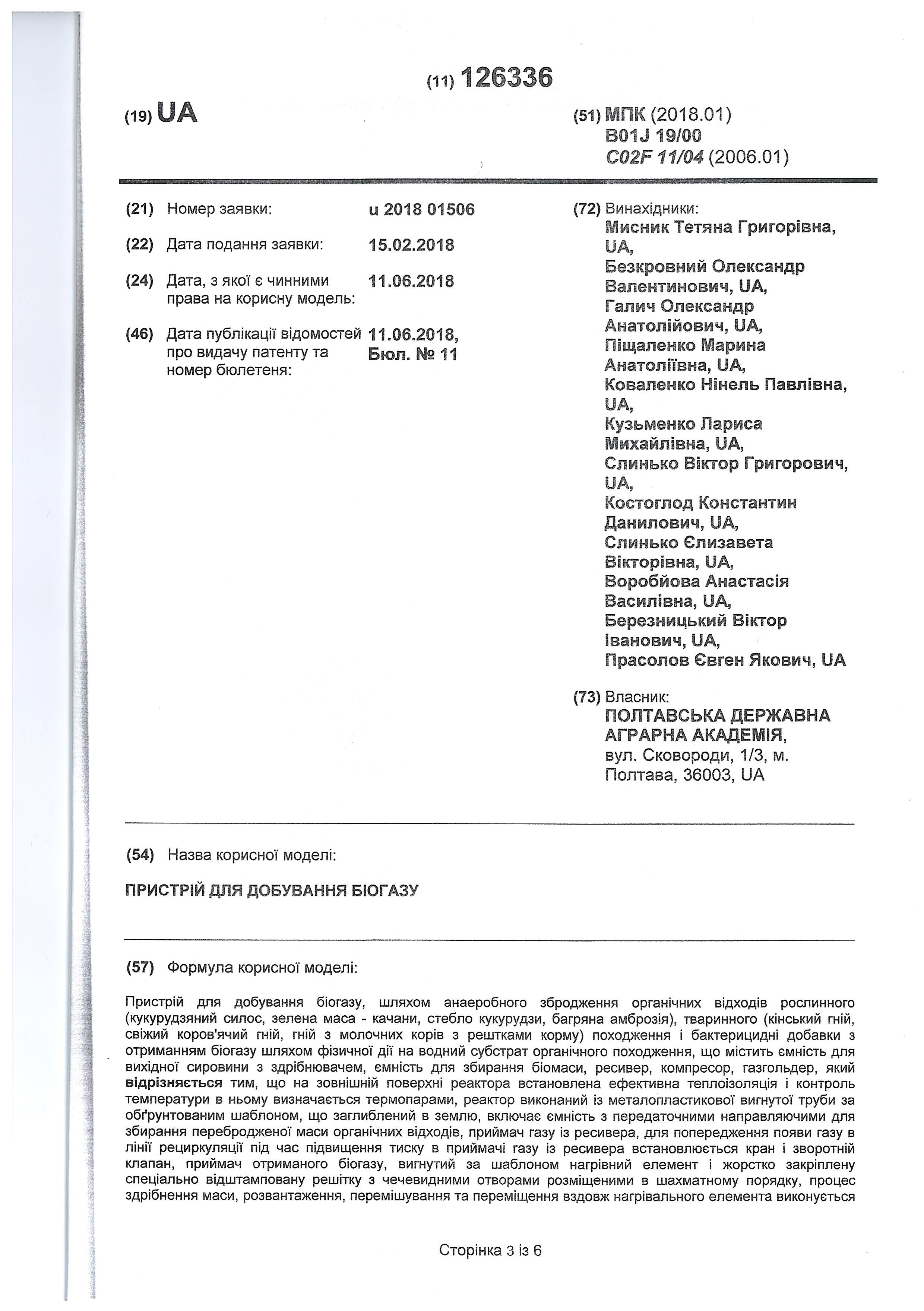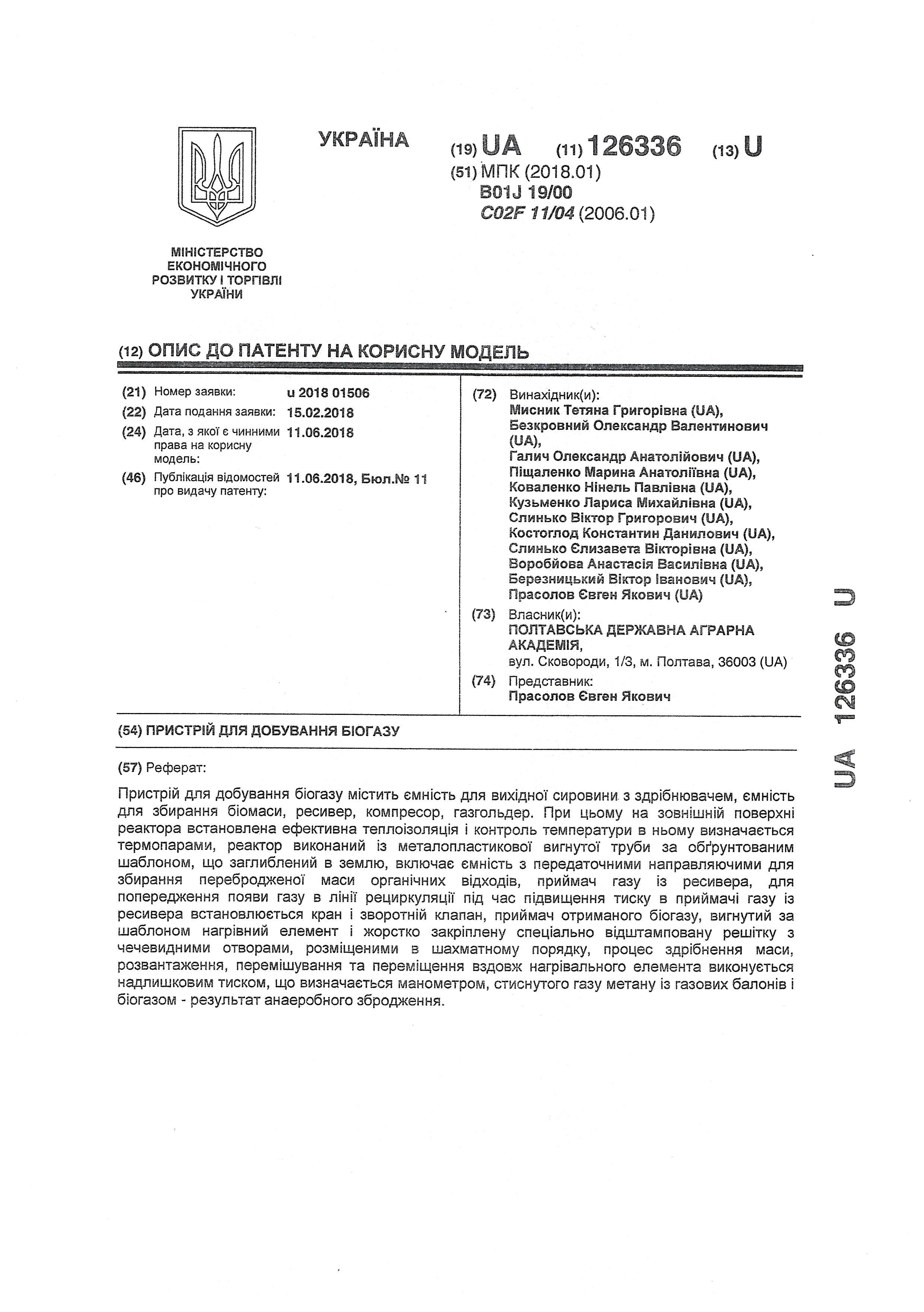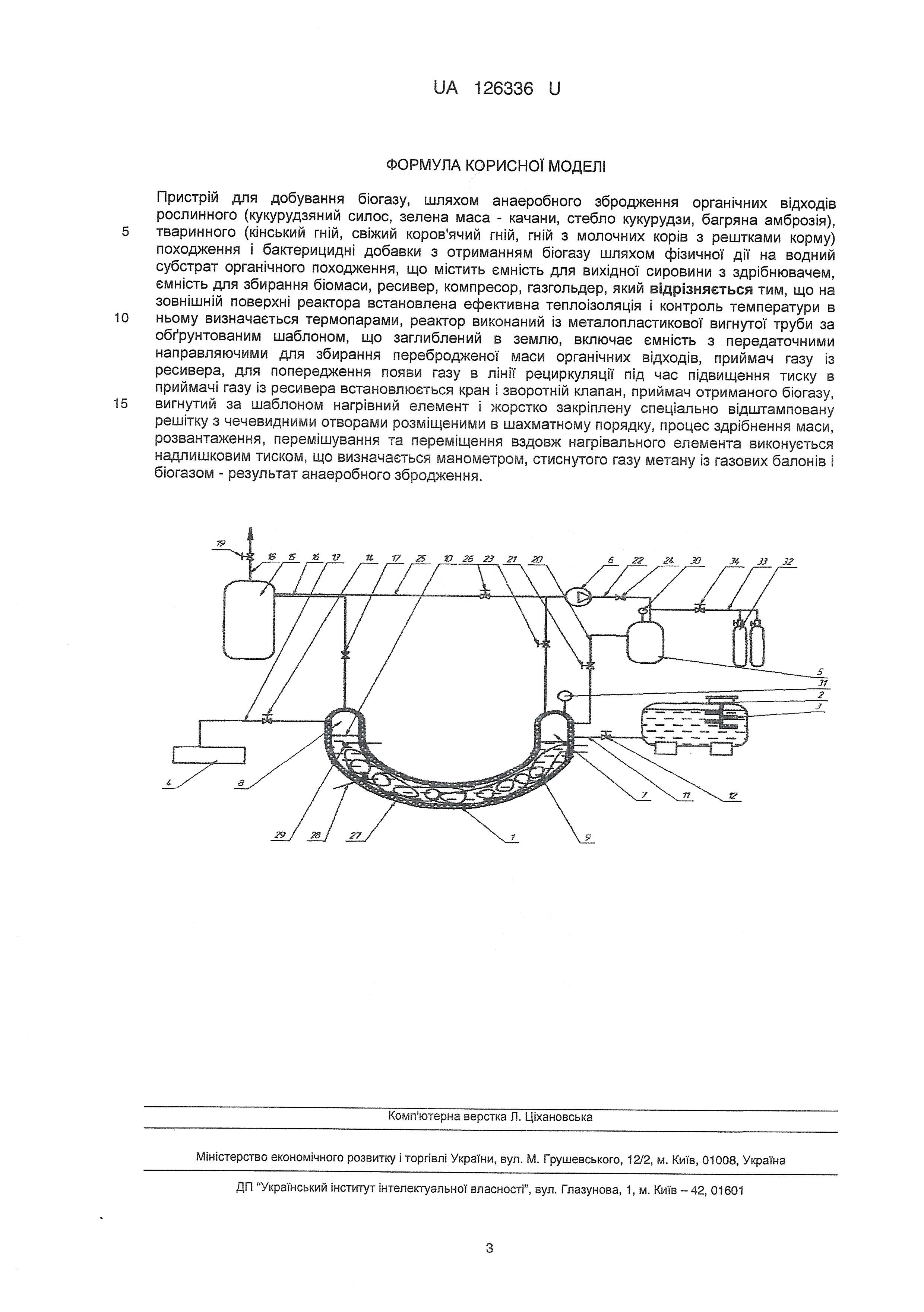 Технічне рішення за корисною моделлю, що заявляється, належить до сільського господарства, зокрема до пристроїв для анаеробного збродження органічних відходів з метою добування метанового газу і вкиорситання його в побуті, а відходи збродження як орагнічне добриво в землеробстві.