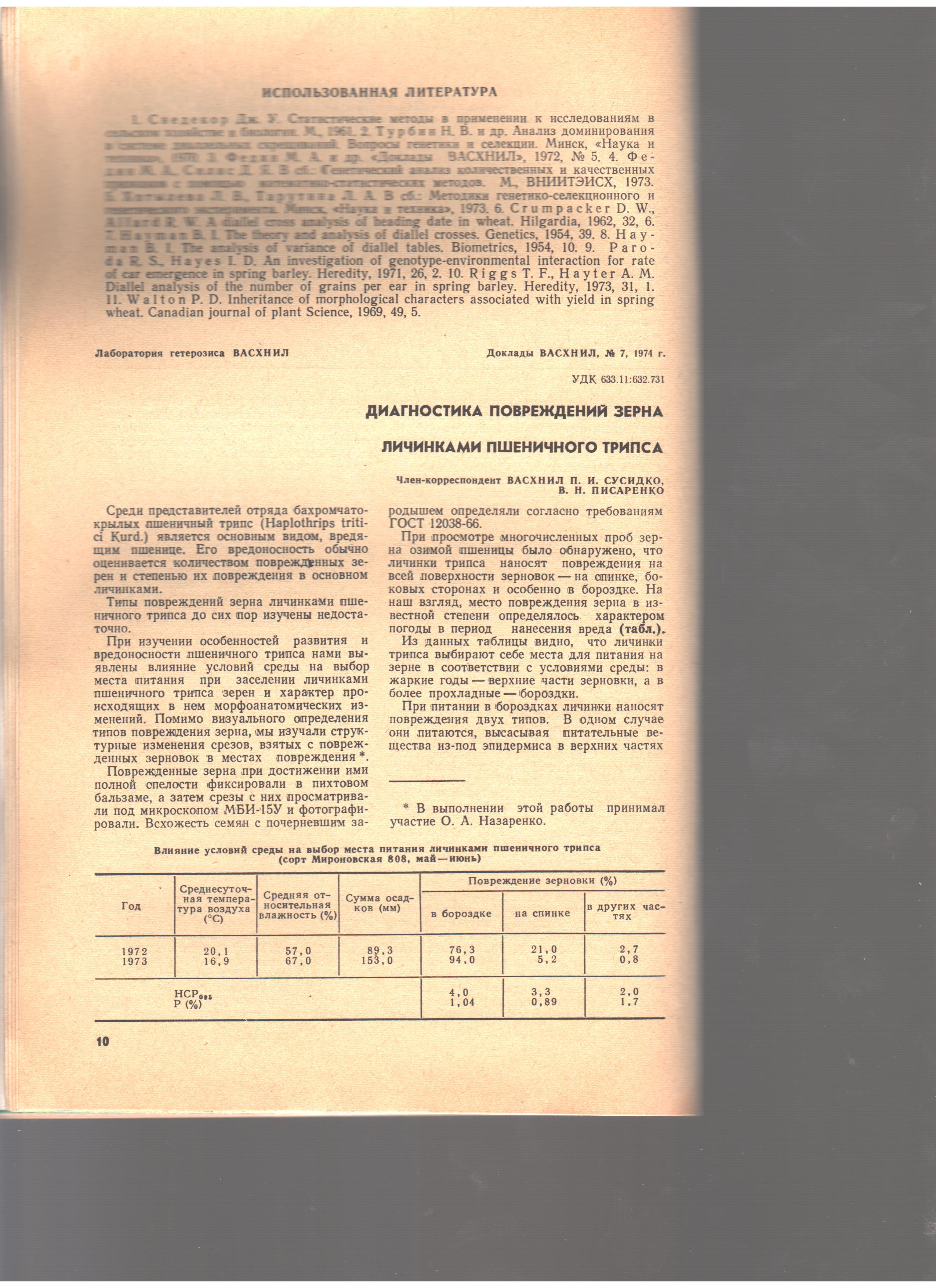 Писаренко В.Н., Сусидко П.И. Диагностика повреждений зерна личинками пшеничного трипса. Доклады всесоюзной ордена Ленина академии сельскохозяйственных наук В.И.Ленина, №7. Москва. 1974. с.10-12