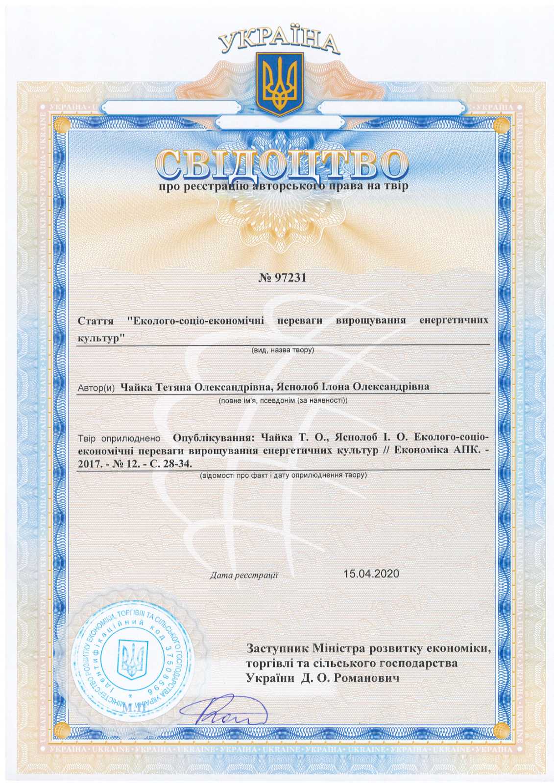 Свідоцтво про реєстрацію авторського права на твір № 97231 від 15.04.2020 р. Еколого-соціо-економічні переваги вирощування енергетичних культур / Т. О. Чайка, І. О. Яснолоб ; опубл. Економіка АПК. – 2017. – № 12. – С. 28–34.